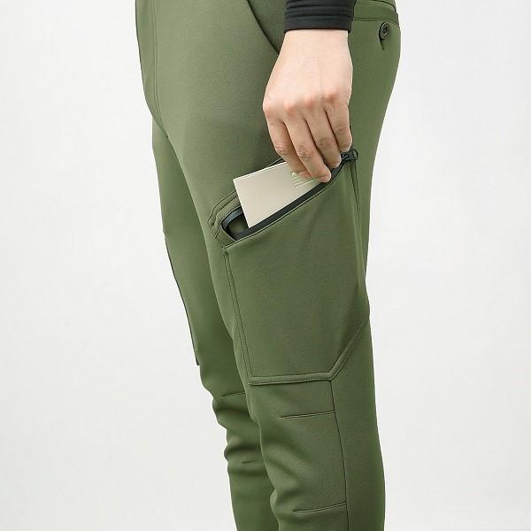 裏地にフリースを使用したボンディング素材で、保温性に優れ、制電加工にストレッチ性、脇ゴム仕様で履きやすい防寒カーゴパンツ。