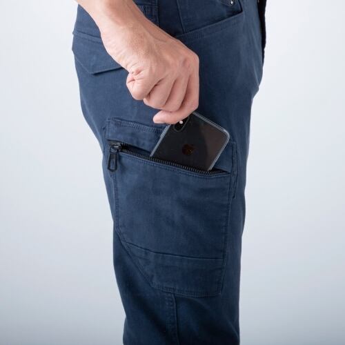 両レッグサイドのカーゴポケットはファスナーを、ヒップのバックポケットはボタン付きフラップをそれぞれ物が落ちにくい様に設計されている。