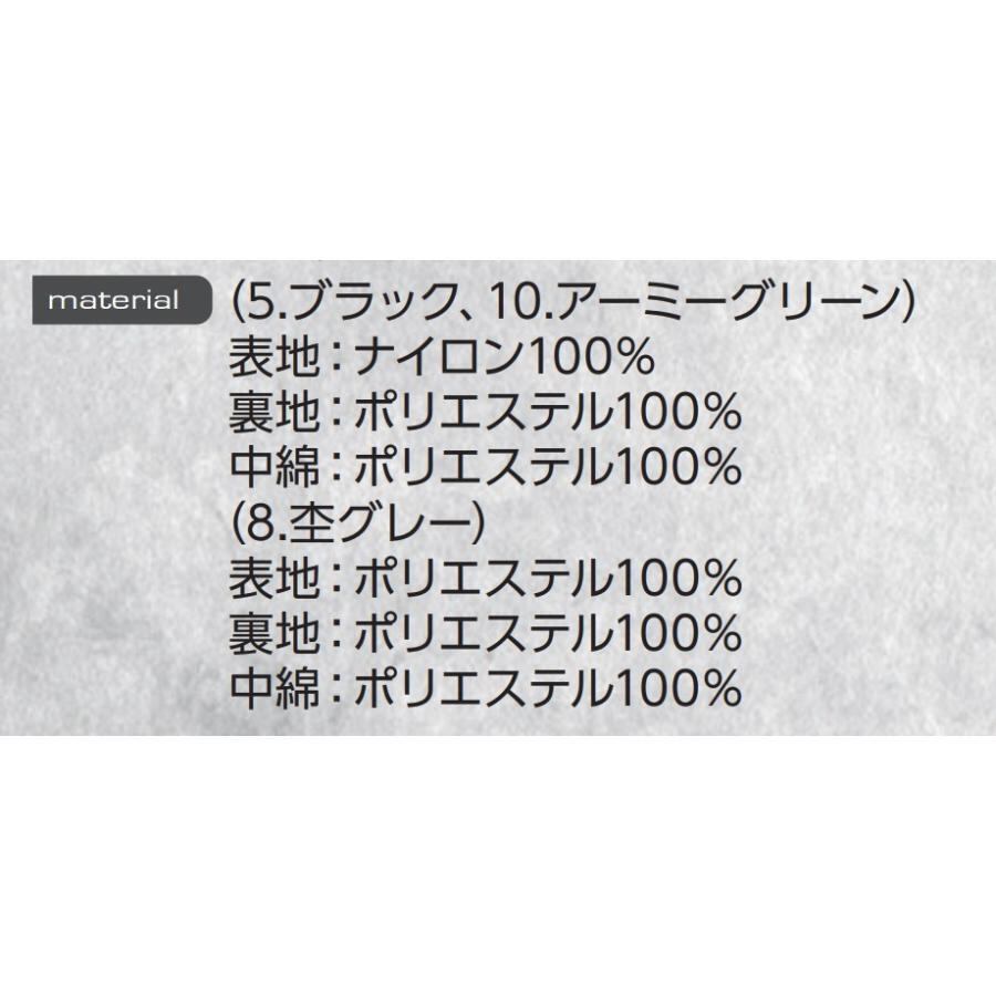 表地:ナイロン100% 裏地:ポリエステル100% 中綿:ポリエステル100% (5.ブラック・10.アーミーグリーン)