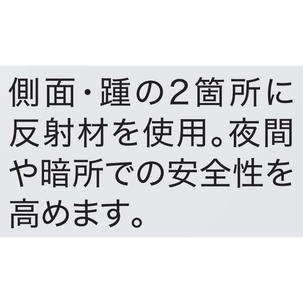 靴の脱ぎ履きが簡単な3本の面ファスナー仕様で、側面・踵には夜間や暗所での安全性を高める反射材付き。