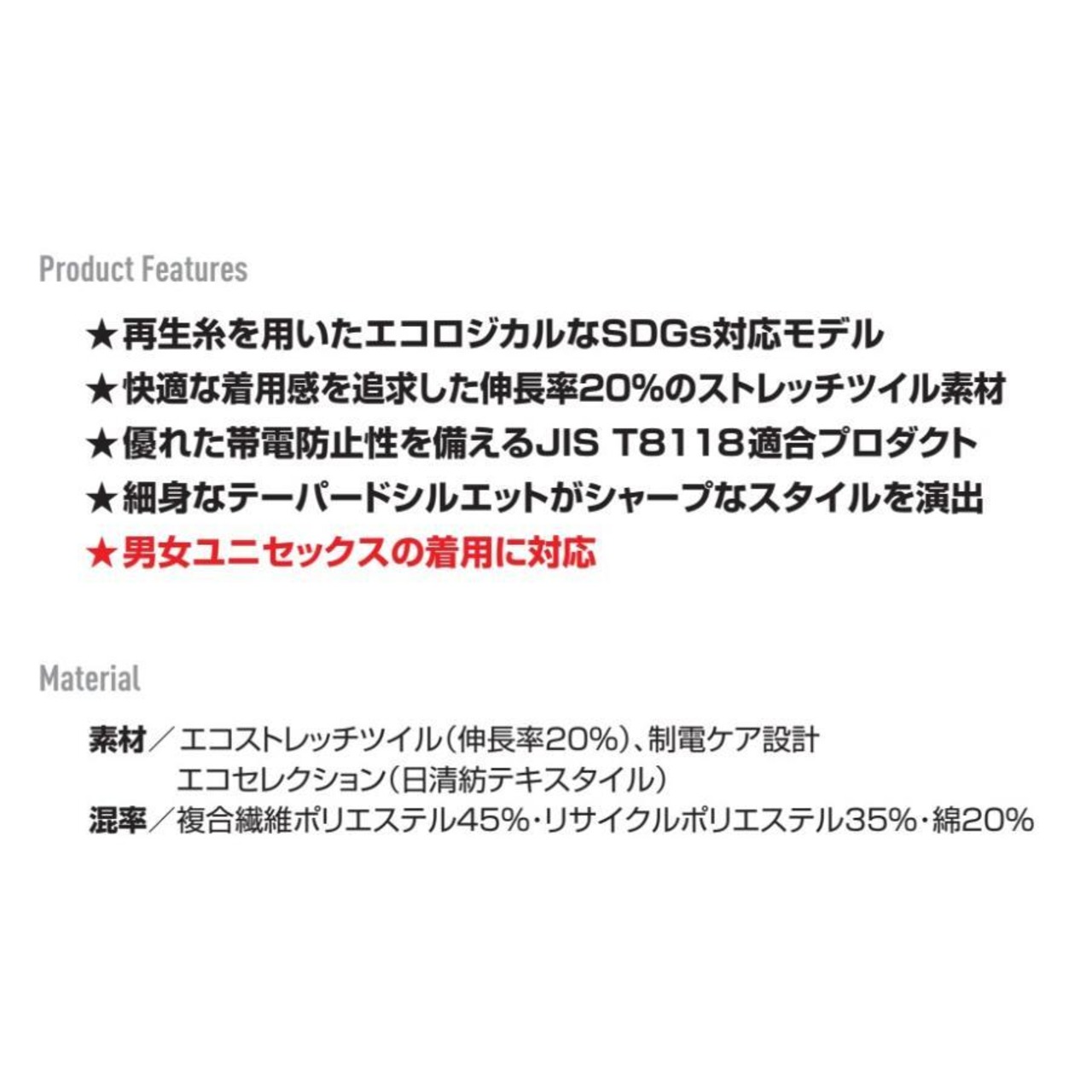 素材 / エコストレッチツイル(伸長率20%)、制電ケア設計