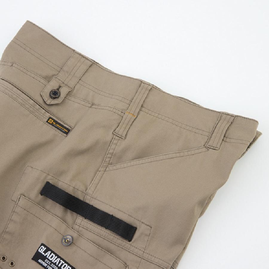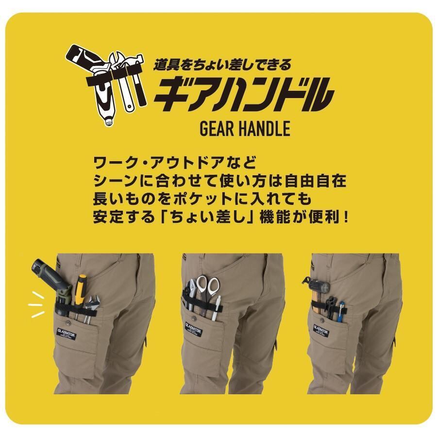 ストレッチ素材で動きやすく、カーゴポケットには工具をちょい差し出来る万能な「ギアハンドル」を装備。